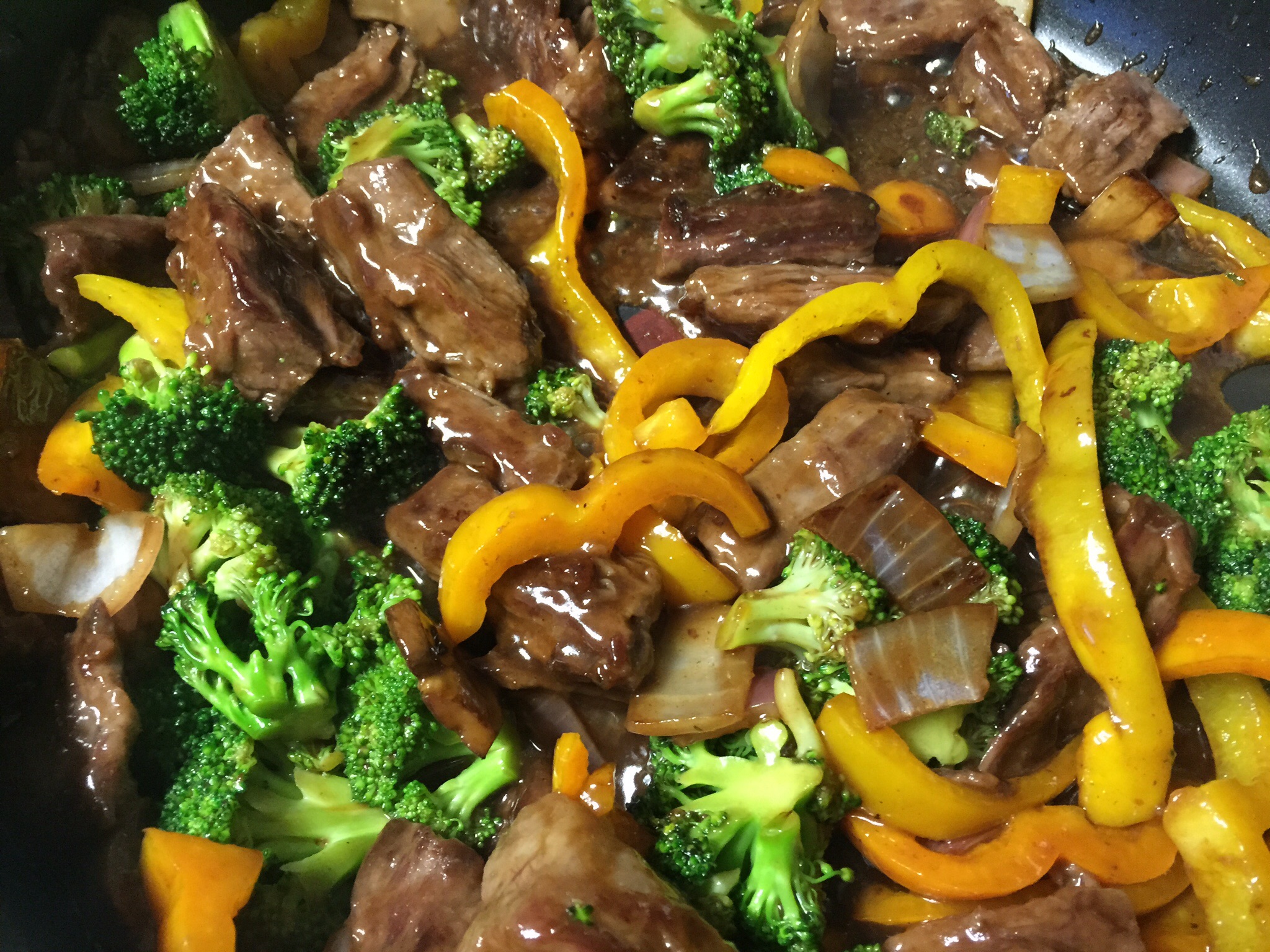 The walk put me in a good mood and worked up my appetite, and I decided on stir-fry beef — a recipe I’ve used several times before. It’s actually called The Best Easy Beef and Broccoli Stir-Fry. It really is easy to make, but what I like best about it is that I can substitute virtually any fresh veggies for the broccoli. Or just put in additional veggies in. Today I added mushrooms and some leftover yellow and green peppers I had in the frig. And although I’ve always used beef, chicken could easily be substituted. I usually make rice with it, but pasta would work, too.And the sauce is so simple, but so amazing. I love the tangy yet sweet taste the mixture of brown sugar, soy sauce, ginger and cornstarch gives the cooked beef and veggies. My mouth waters with each bite. Yum!