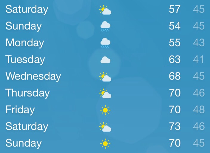 Zero. Zip. Nada. Daytime highs in 50s, 60s and 70s, lows in the 40s. I’m so excited! The lettuce might finally get a decent, consistent chance to grow. And I’m cautiously optimistic that I can put away the tarp – or maybe use it in the garage for a DIY project.