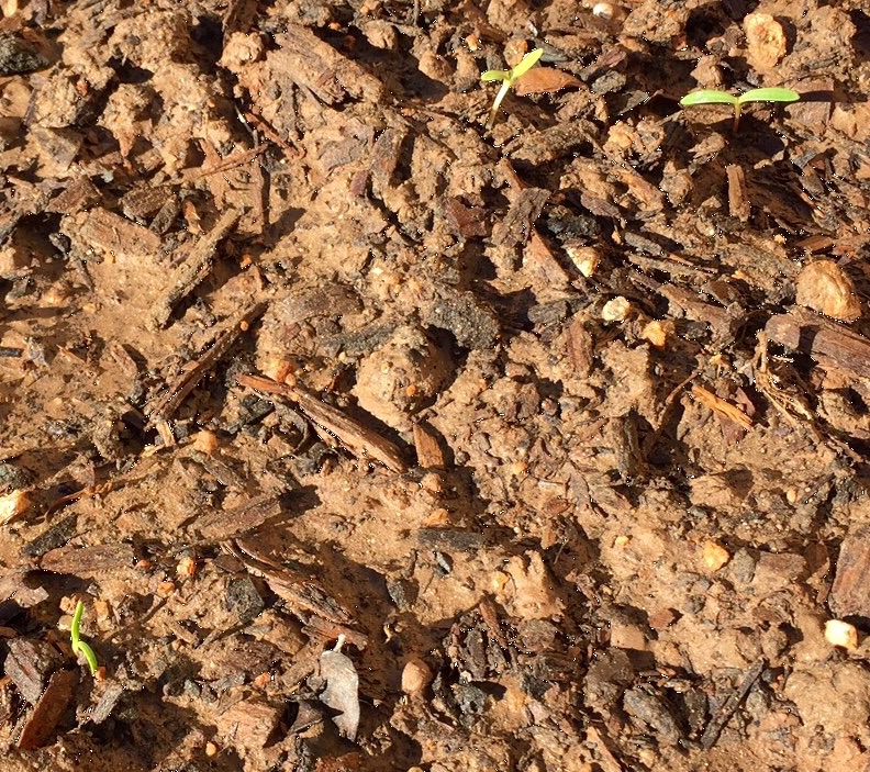 Seeds have sprouted in two of the three tiers; the lower one, which has painted daisies and cosmos, and the middle tier, which has a mixture of zinnias and another type of cosmos. Didn’t see any sprouts in the upper tier, which has California poppies and gazania, but hey, two out of three’s not bad, right?