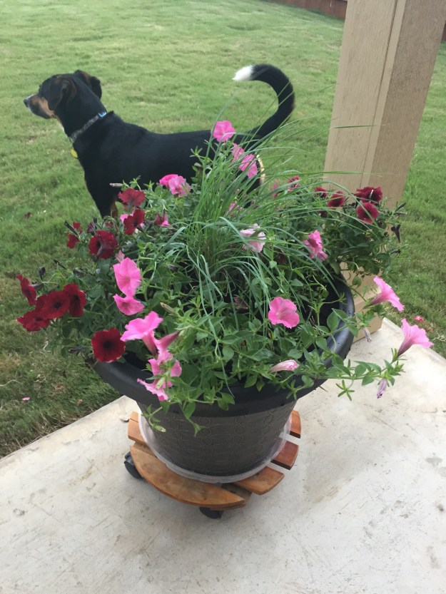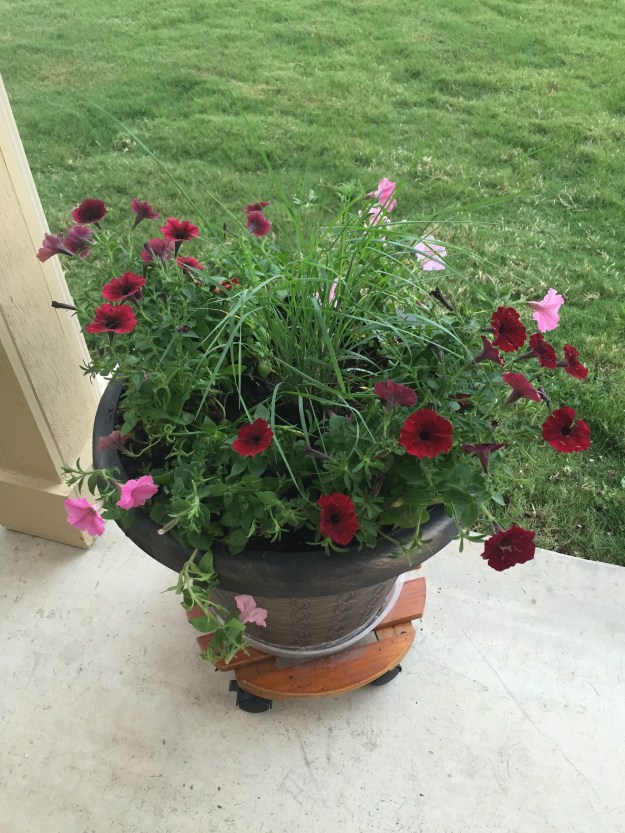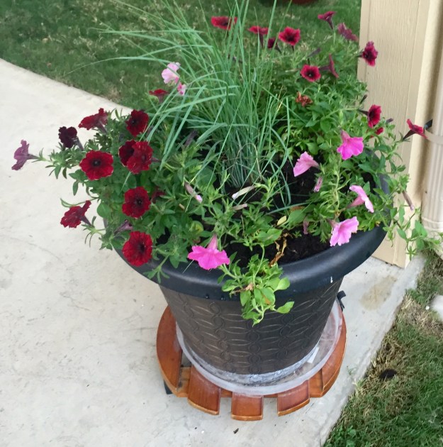 Finally. The failed lettuce is gone from my patio containers, replaced by Black Cherry and Bubblegum Supertunias and Pink Champagne Ruby Grass.