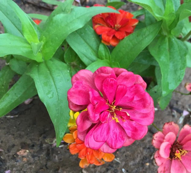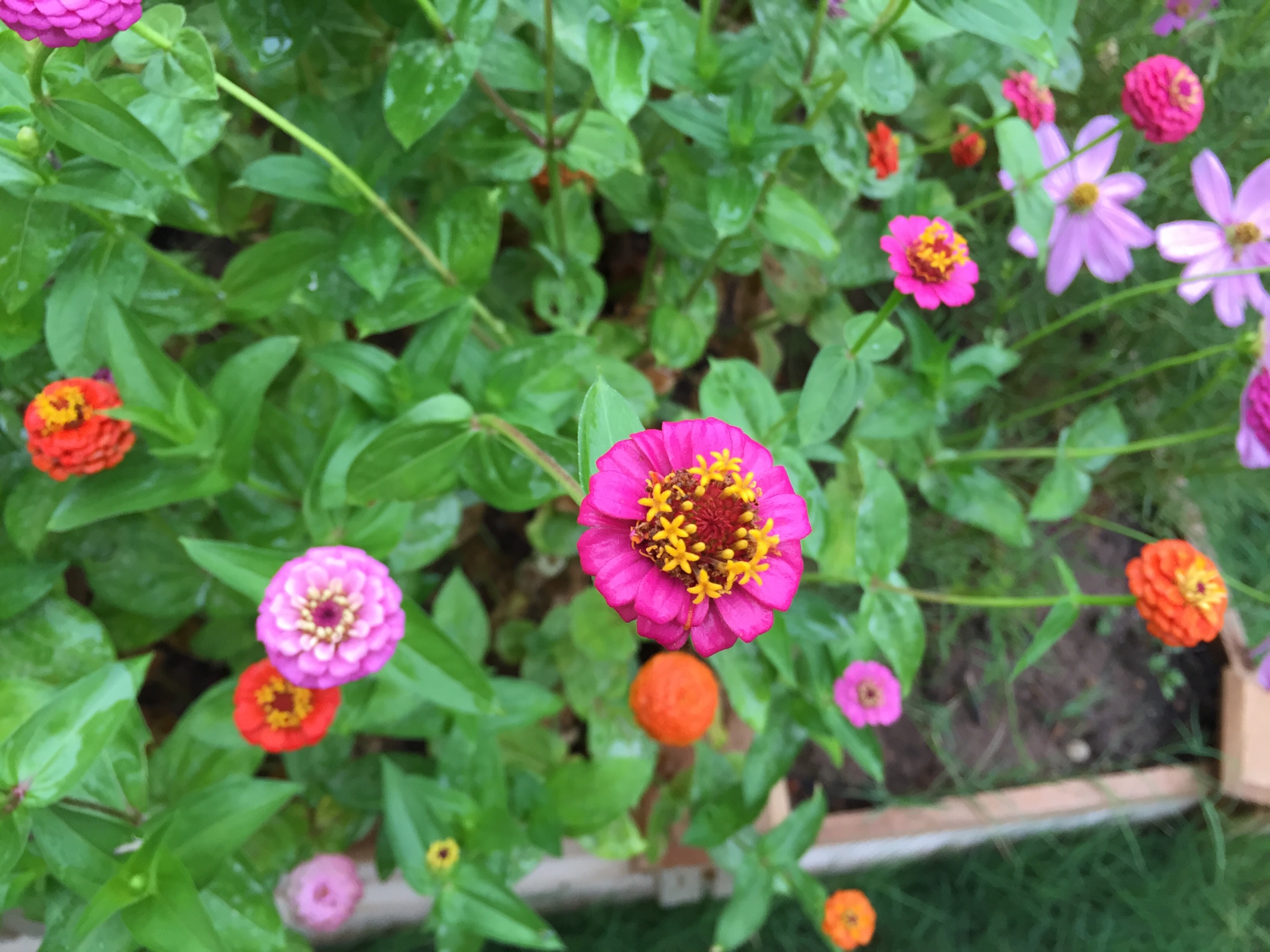 Raindrops on flowers like cosmos and zinnias.