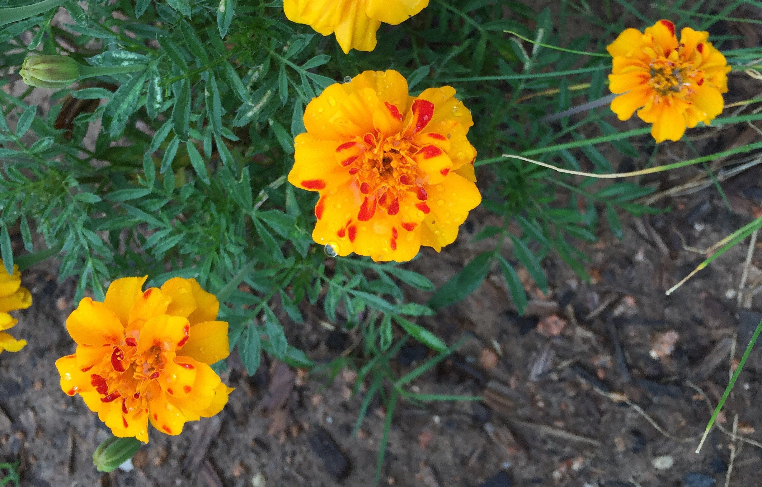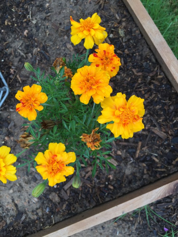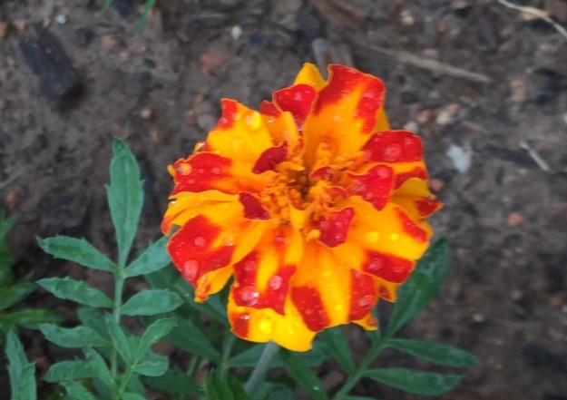 Marigolds glisten with kisses from heaven.