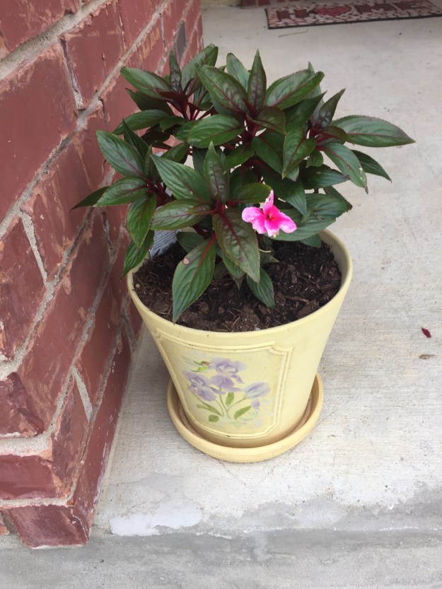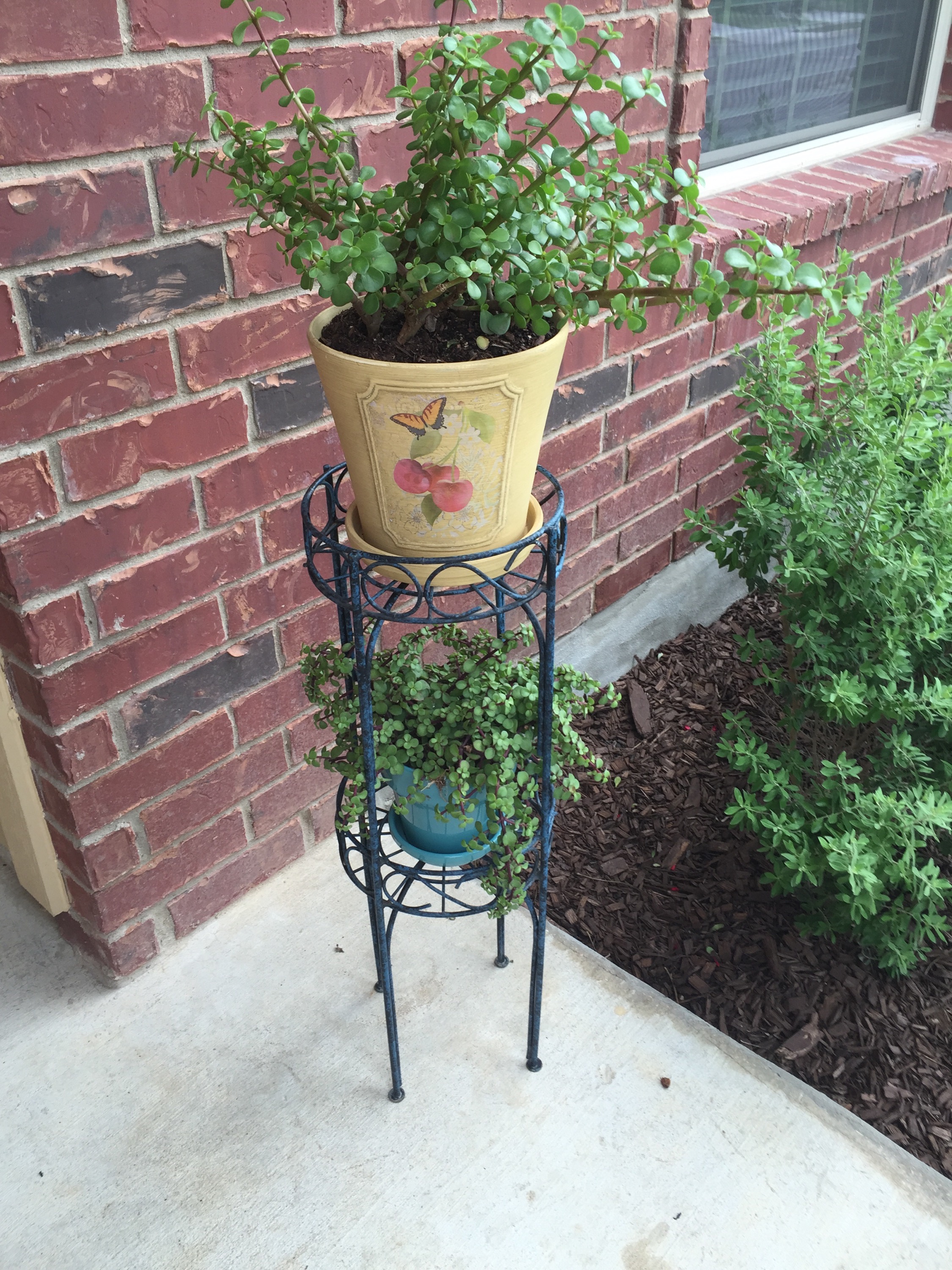 The newest additions to my flower planter collection includes this cute metal planter I found at a flea market in Burnet, Texas. I bought two 8-inch pots similar to the one in the top tier with the intention that the matching set would be perfect.