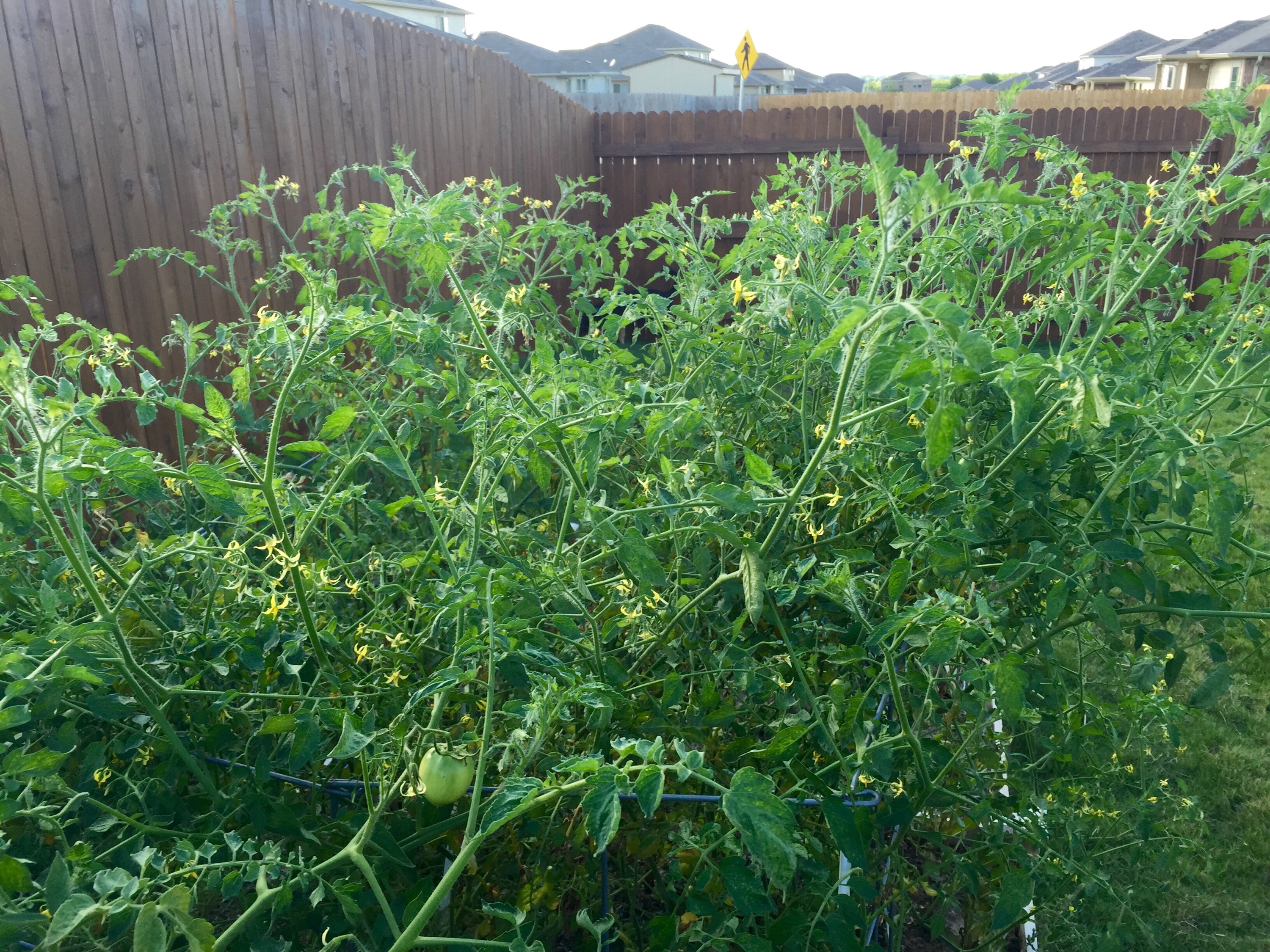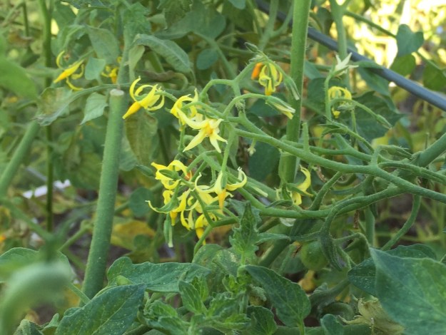 Despite leaf-footed bugs (and crows, I’m thinking now) getting at my big tomatoes, the blossoms just keep coming on my Super Sweet 100s. The cherry tomatoes haven’t produced as many red tomatoes yet as I hoped they would, but all the blossoms give me hope.
