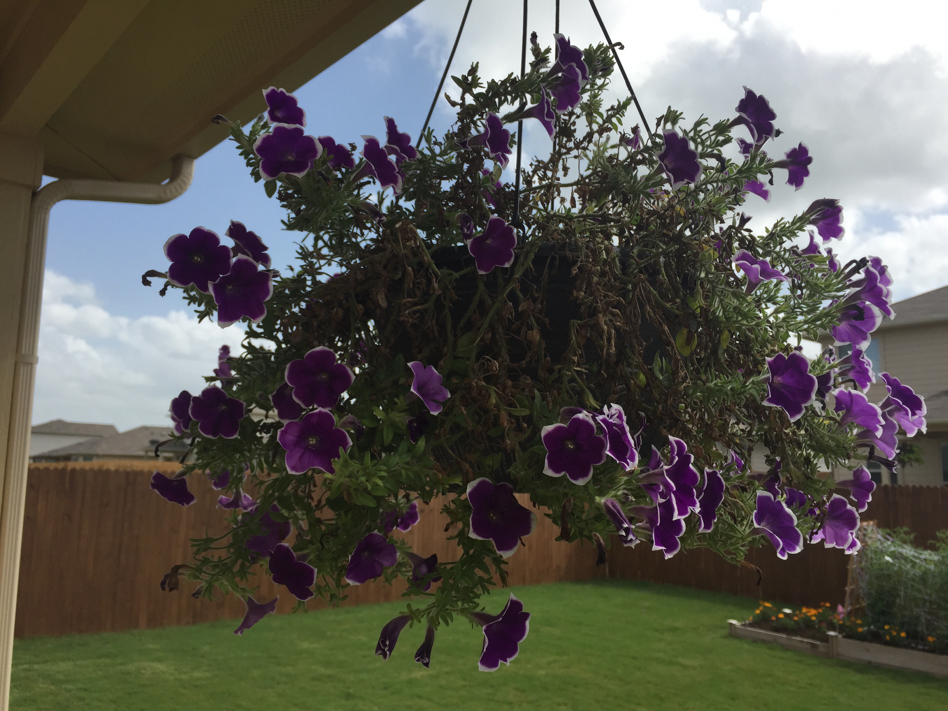 I just hope they survive the wind, which has been a beast the last couple days. Yes, it’s nice to have a breeze when it’s hot, but it’s not so kind to the flowers. In fact, I moved a hanging pot of purple wave petunias down to the concrete because I thought it was going to blow off the chain. The planter had been looking better since I gave it some flower food, so I hope it survives the wind.