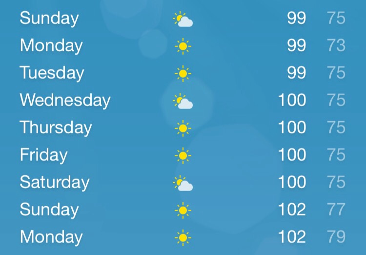 For the first time since our family moved to central Texas almost a year ago, the forecast calls for numerous consecutive days at or over 100 degrees. We saw a few 100-degree days last August, but I’m told it was a relatively cool summer by Texas standards. The same has been true for this summer, although I think that’s about to change.