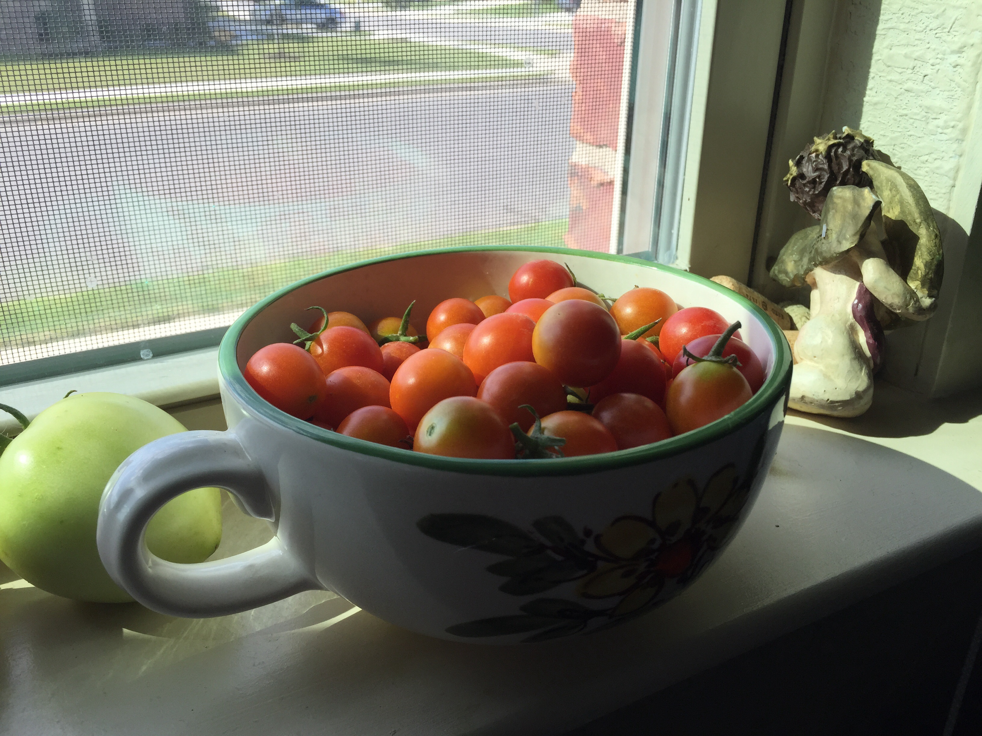 I just hope I can pay enough attention (read: water, water, water) to my tomatoes so that all the remaining green ones ripen, and they, too, can have the honor of filling my grandmother’s bowl on my windowsill. Will watering in the morning before I go to work, and again in the evening be enough? I know that tomatoes like heat, but it remains to be seen whether they like day after day of 100 degrees. I hope so, because I really want them in my kitchen.