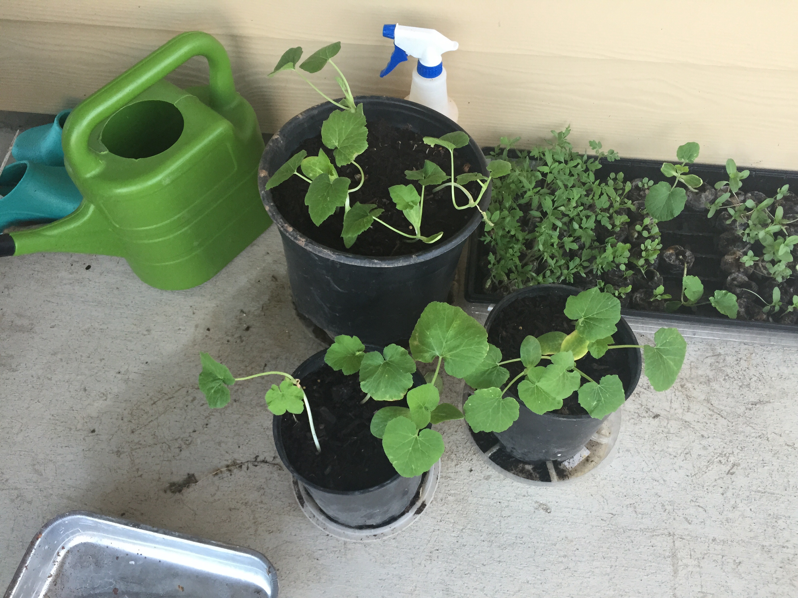 The pumpkins I transplanted last week also seem to be faring well. The first couple days were kind of rough, but they seem to have rebounded. It’s like they know only a couple of them will get transplanted into the big raised bed. Each one is trying to outgrow the other! And they’ll soon outgrow the pots.