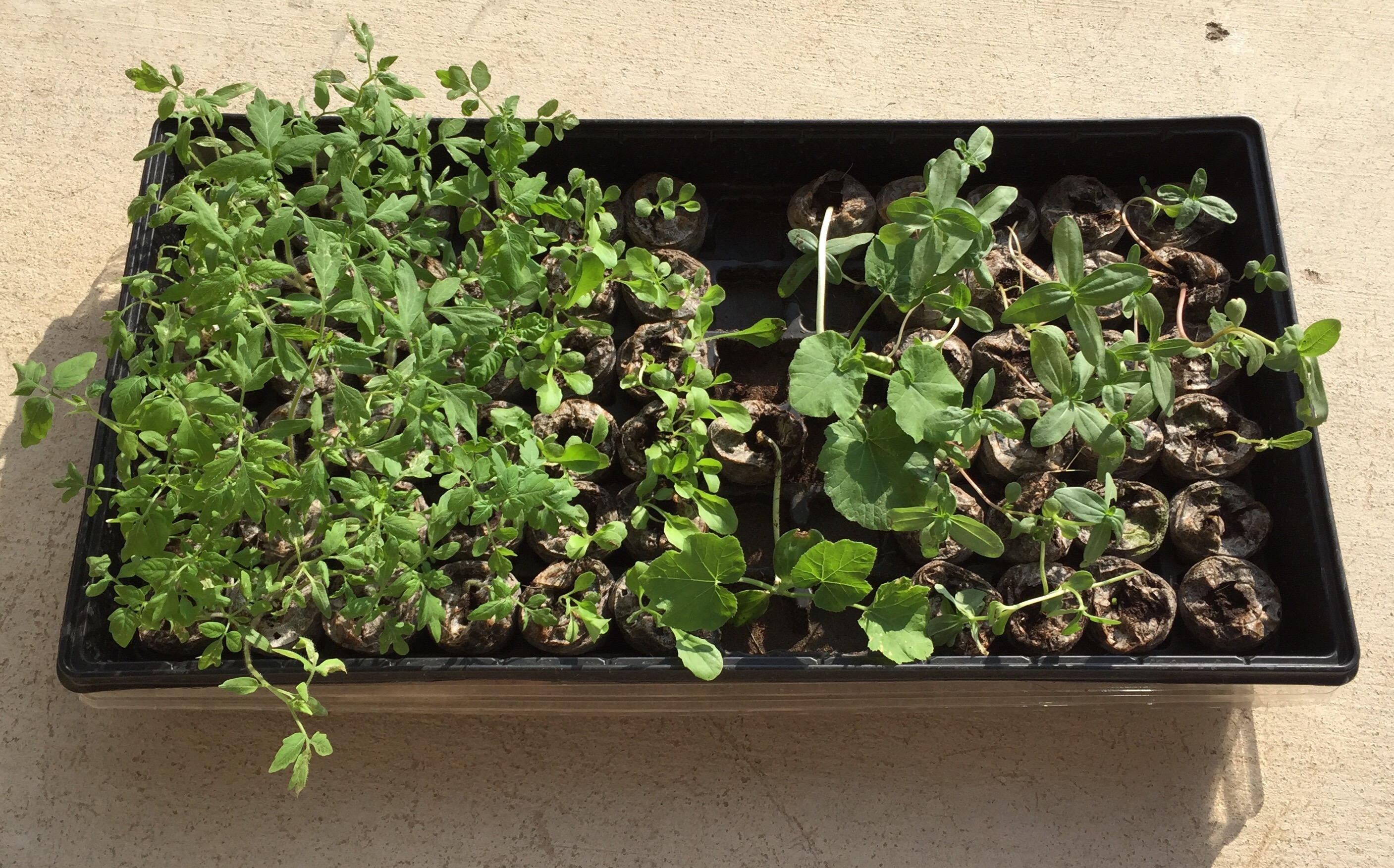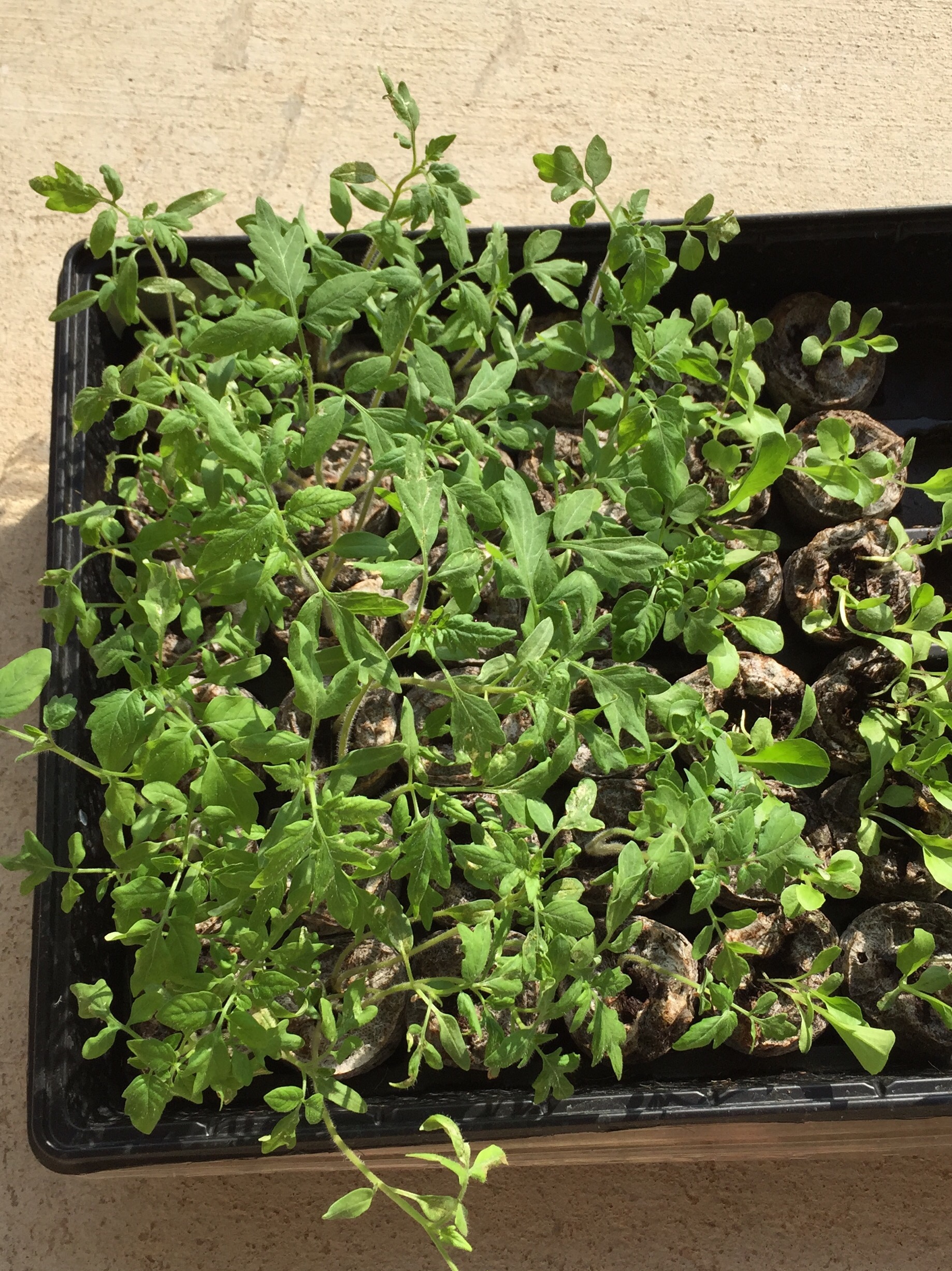 Doesn’t matter how hot it’s gonna get this weekend — the tomatoes need transplanting. There’s about a gazillion of them in peat pellets, so I’m gonna have to whittle them down to just a handful.