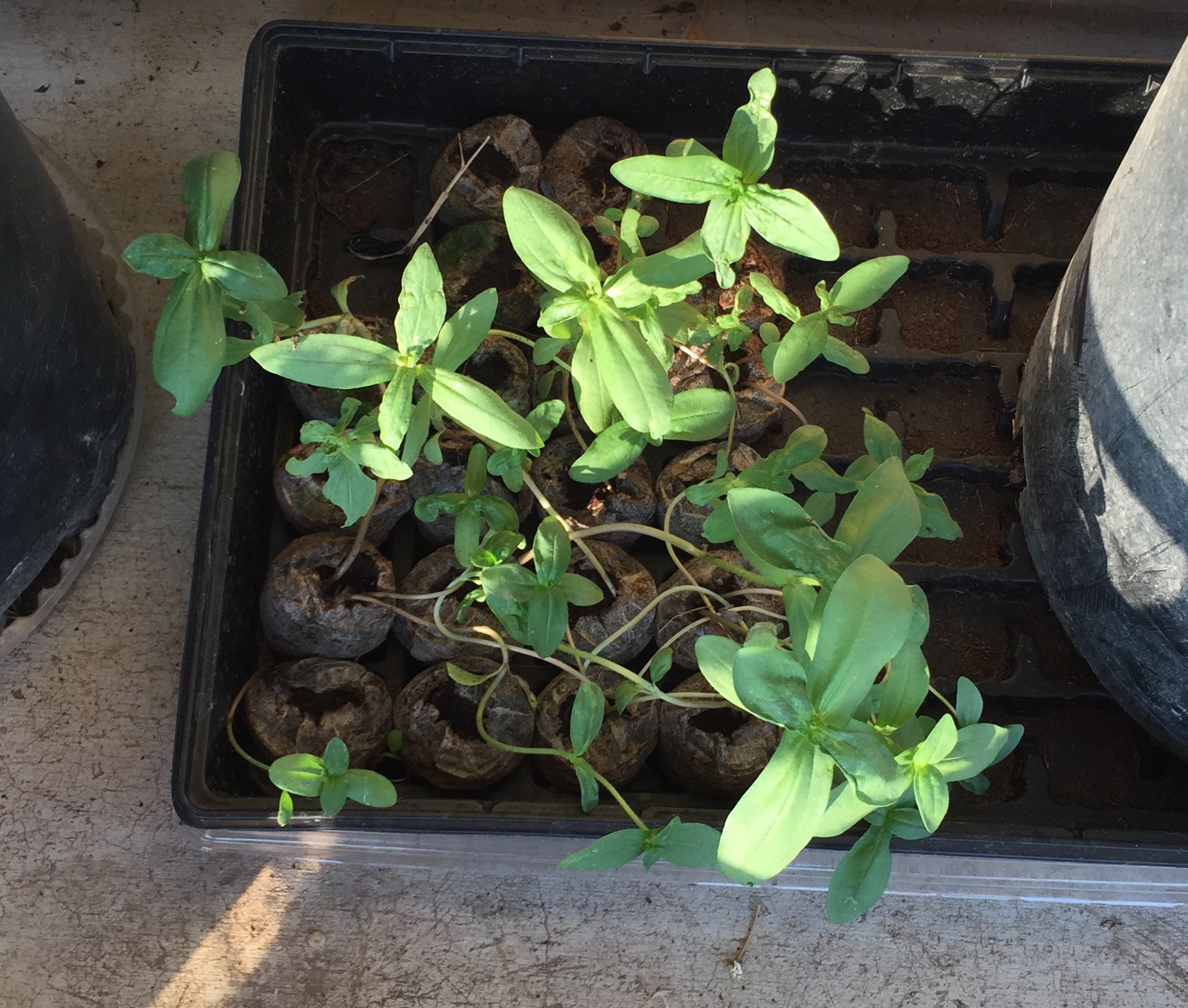 Another weekend, another hot forecast. Doesn’t matter though, need to find time to get the zinnias (above) transplanted into a flower bed. They’re definitely outgrowing the peat pellets; they really need their own, larger space.