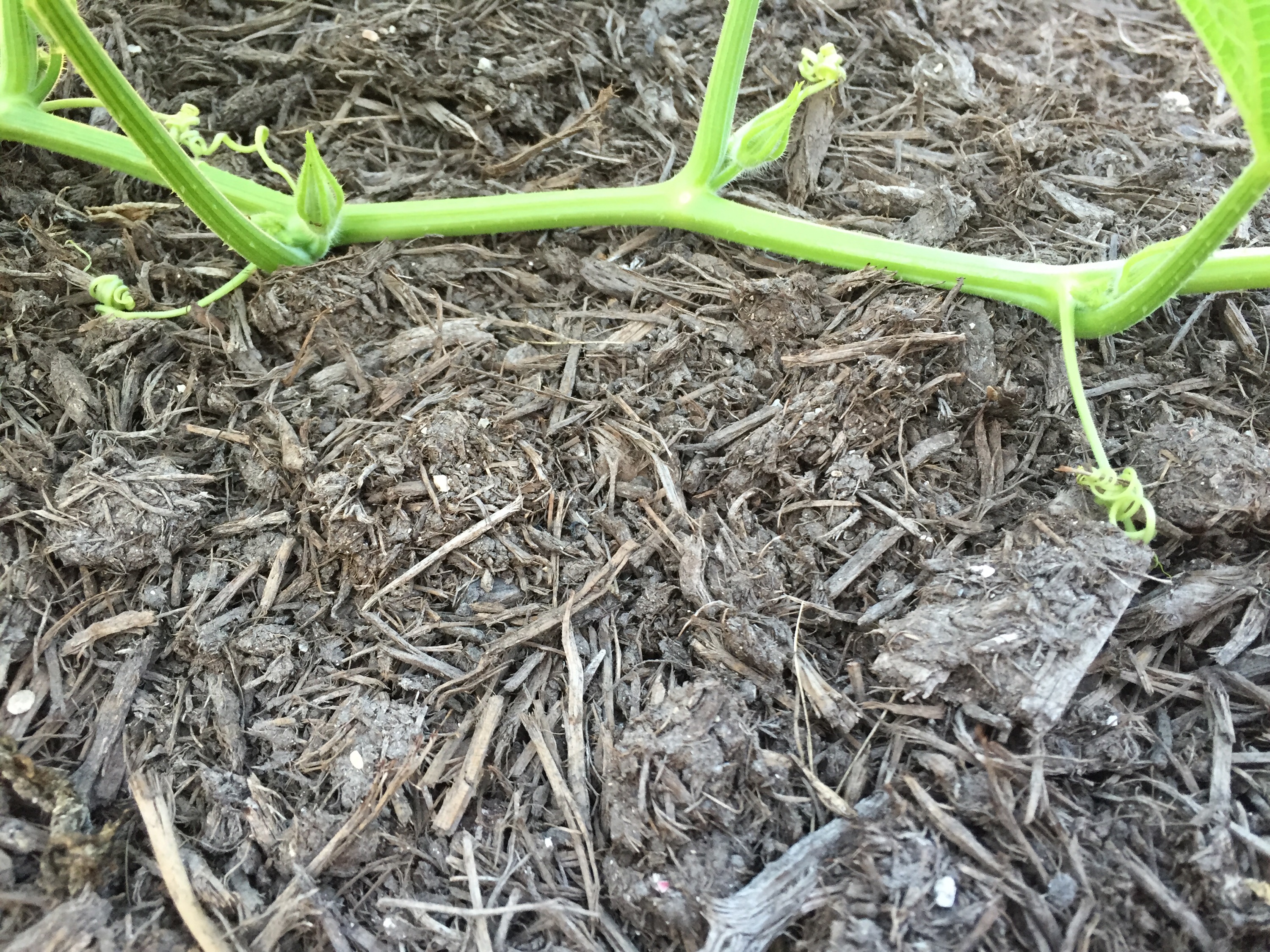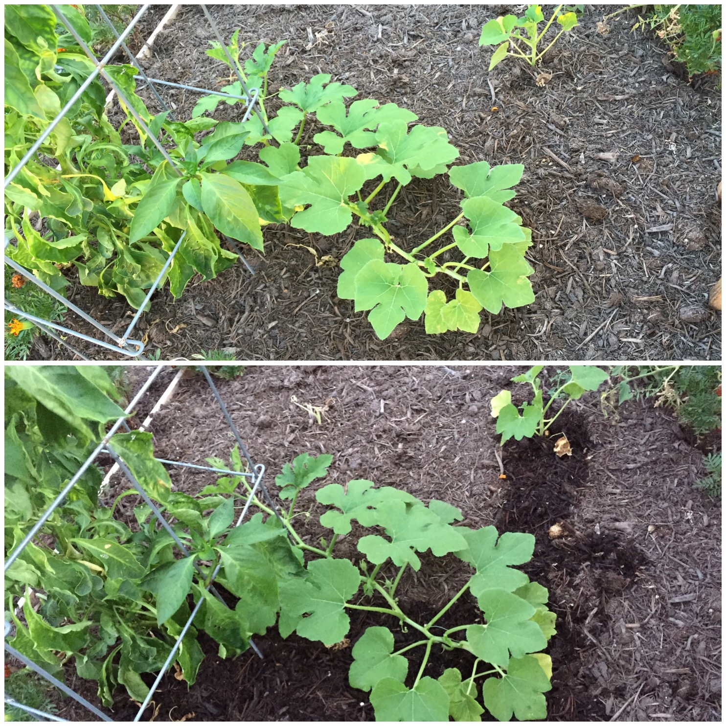 Wanda the wandering pumpkin keeps stretching out a couple inches a day as evidenced in the above photo, which shows the pumpkin Friday night (bottom) and Sunday night (top). I love having a physical marker to make comparisons — in this case I use the edge of the cage holding the pepper plant at far left. I sure hope it stays healthy.