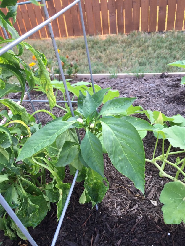 I pretty much had expected that the handful of peppers growing on the plant would be the last for the summer, but flowers on the offshoot indicate maybe I doomed it too early. Whatever. I’ll take more fresh green peppers. Hopefully the plant will survive being crowded by Wanda, my wandering pumpkin that keeps creeping more and more each day.