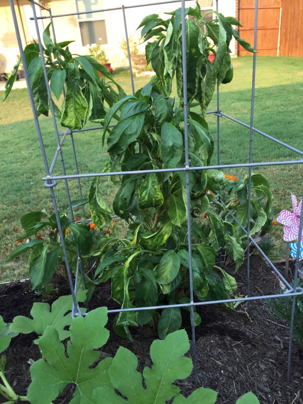 My pepper plant looks pathetic. It has for quite awhile now, but I keep watering it because the peppers were still growing and the wilting leaves didn’t seem to be an indication that the peppers wouldn’t keep growing. So imagine my surprise when I noticed one offshoot whose leaves don’t look like they’ve spent the day (er, weeks) under sunny skies in 90-something-degree heat.