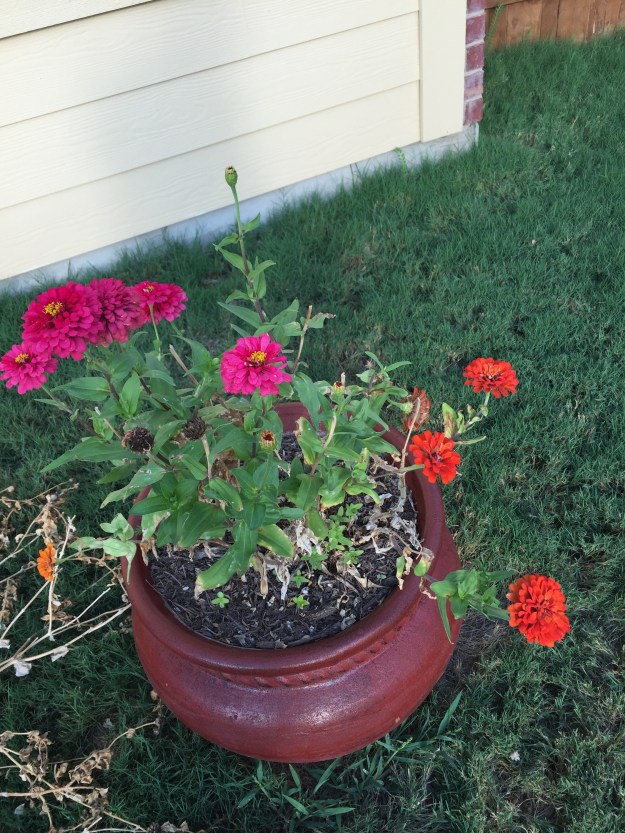 I’m constantly amazed at how productive zinnias are. Just when I thought the zinnias in my pots were on their last legs, I see more buds popping out of the leaves.