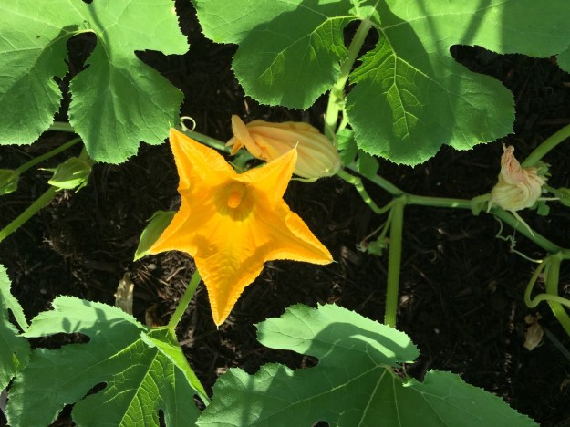 During the week, I don’t often have time to walk out to the garden before work, so I miss the things that only happen in the hours after sunrise. Like flowers opening on pumpkin plants.