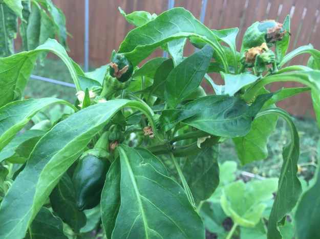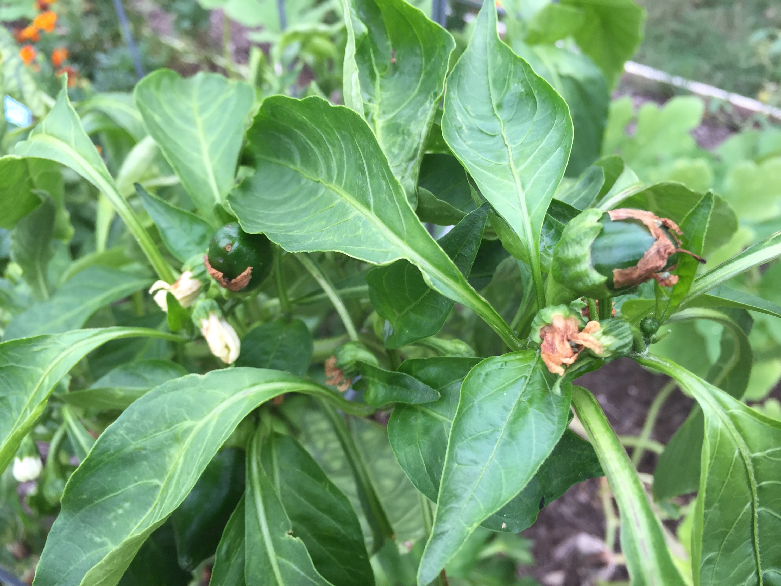 The pathetic-looking pepper plant in my garden continues to produce tiny little peppers. I counted at least 13 little fruit on the plant, and there are more flower blossoms, too.