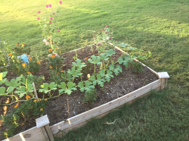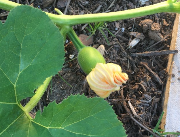 Wanda, my wandering pumpkin, continues to stretch out. She’s started trailing onto the grass, so I suppose I’ll have to try to train her to grow back into the raised bed soon. If I can’t, husband probably won’t like to mow around her.
