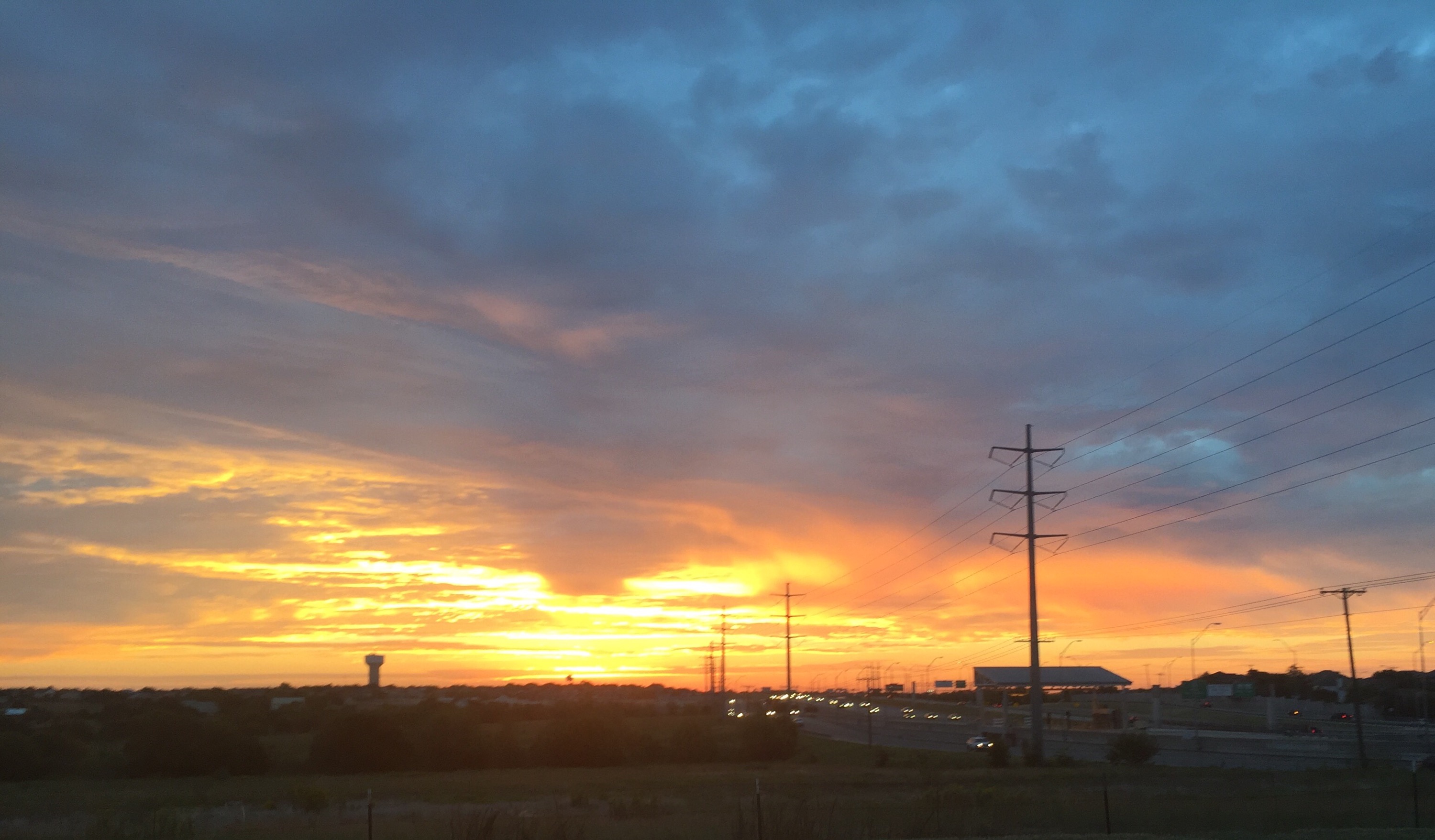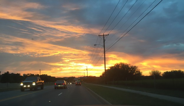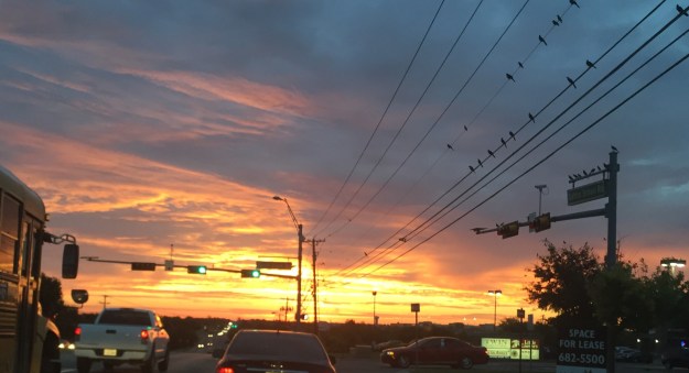 This morning’s was amazing. It was almost like the earth was on fire at the horizon with the clouds turning pink and blue from the smoke. Like the molten center of a volcano was exploding somewhere, lighting up the sky with deep yellows, oranges and reds. The clouds out futher looked like smoke or gray ash.