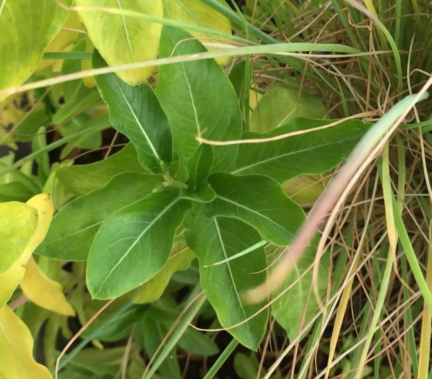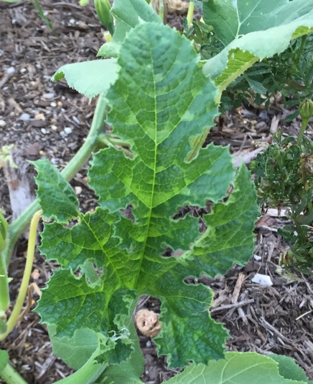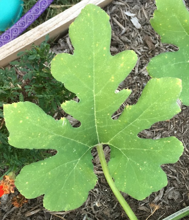 The photo at the top of blog post is a pumpkin leaf. In the middle of the long pumpkin vine known as Wanda in my garden, are a bunch of leaves that have milky white splotches spreading out from the veins. I love how they look.