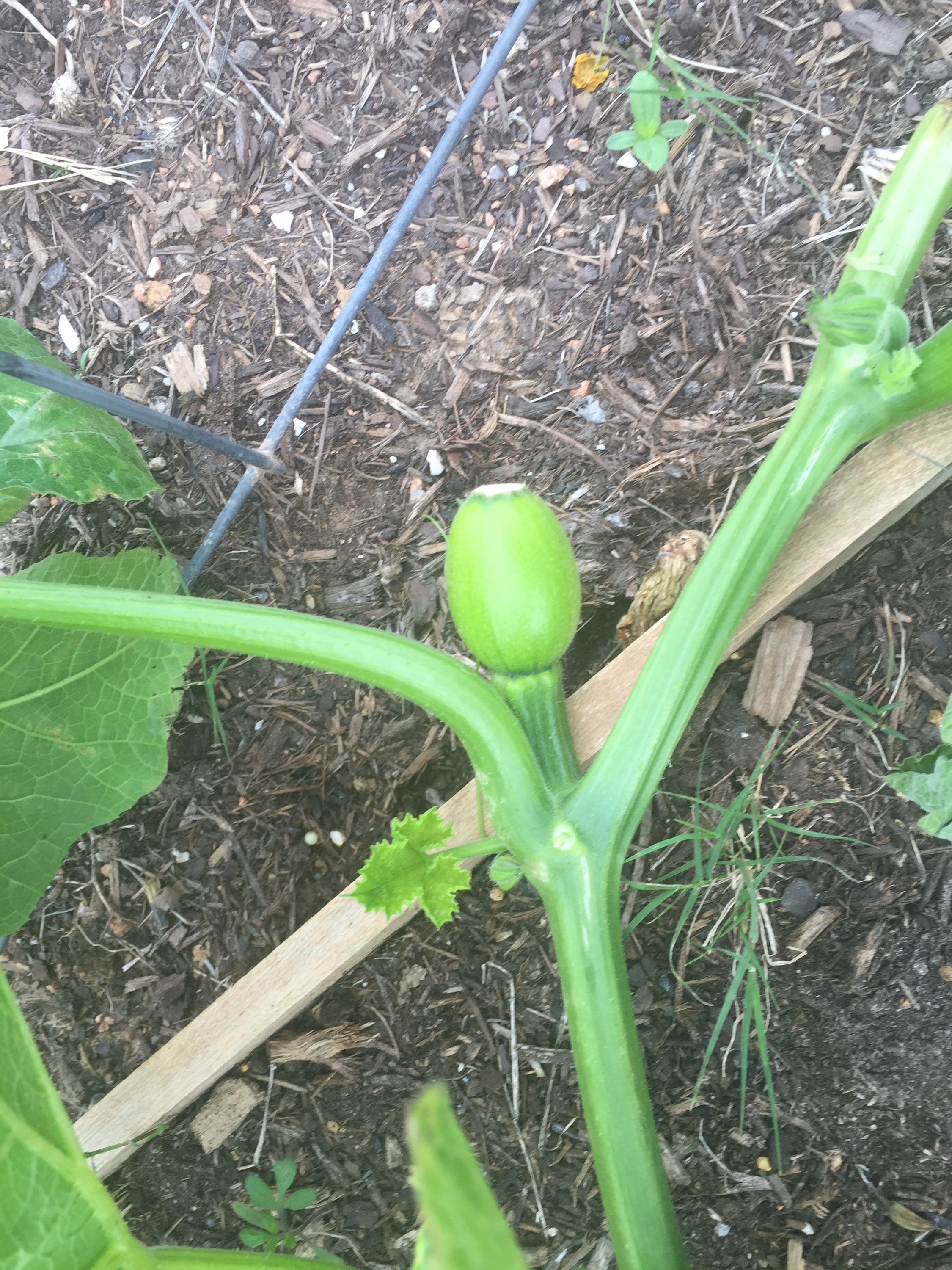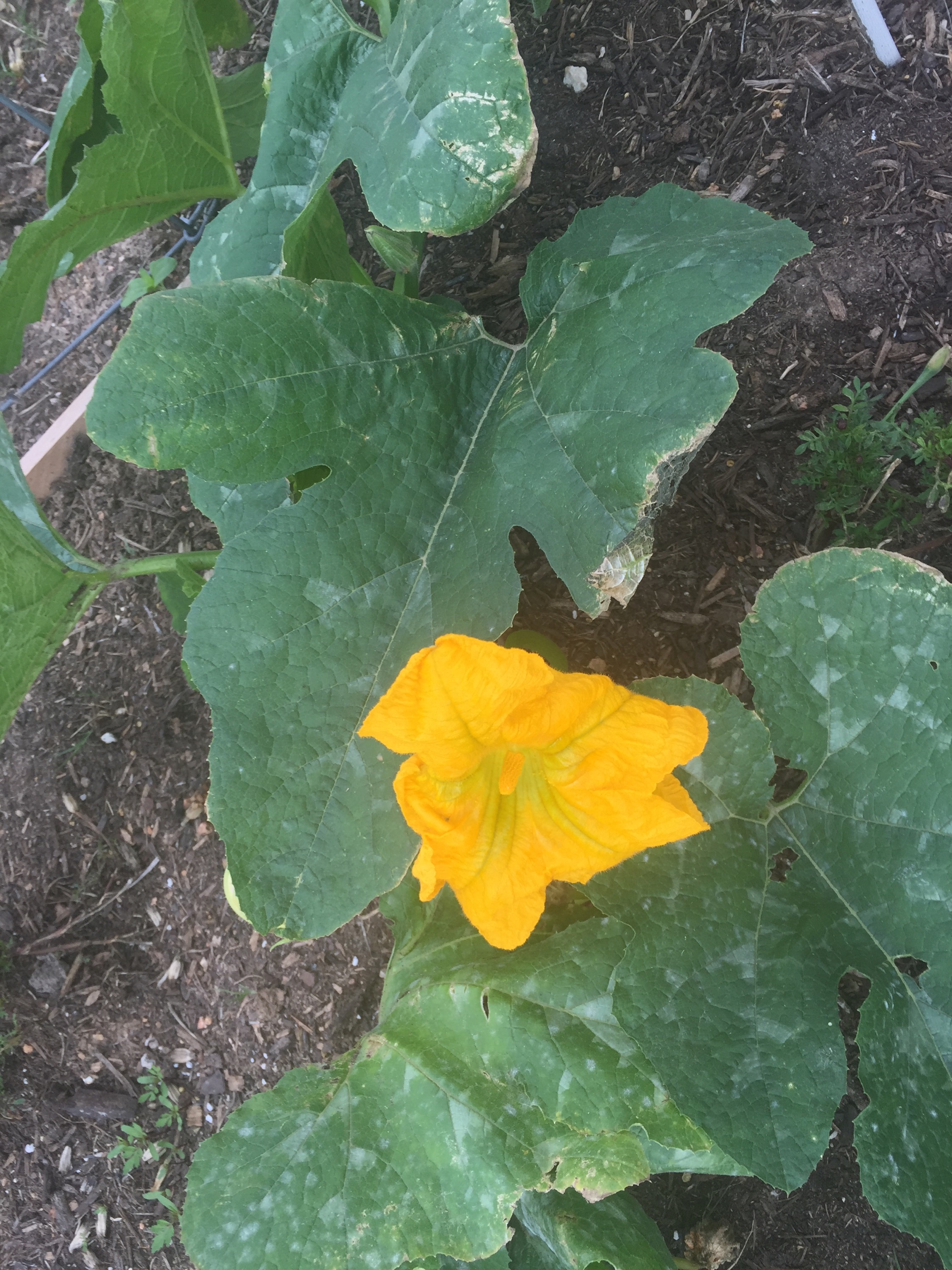 The big pumpkin is on a plant named Wanda. This flower and the tiny pumpkin below are on Cosmo, the other pumpkin plant. Cosmo was a late bloomer and is a lot smaller than Wanda. I’m not sure it’s going to get a lot longer than its current 5 to 6 feet, but I’ll let it go as long as the tiny pumpkin keeps getting bigger. It’s not like I need the space for anything else in November!