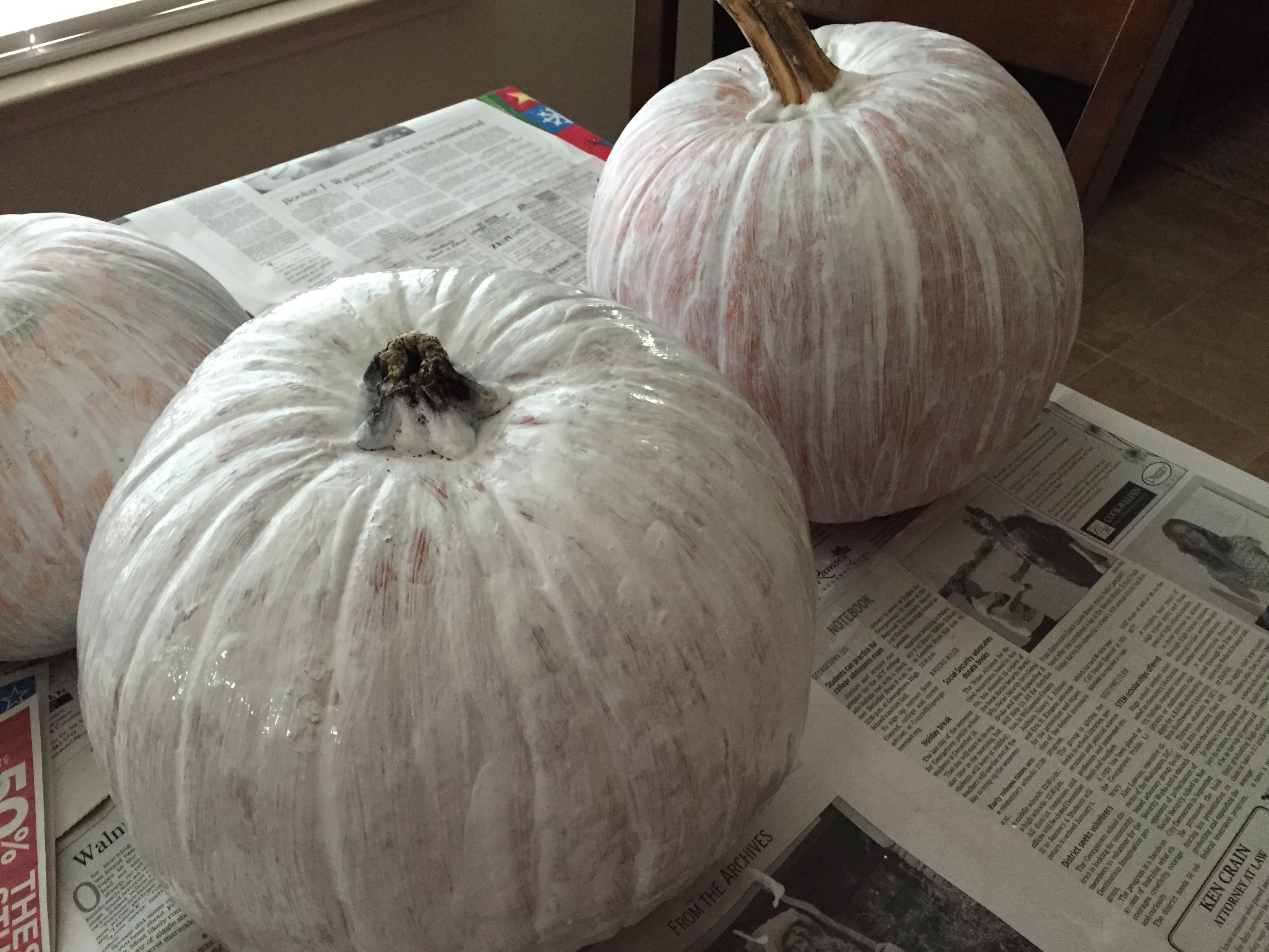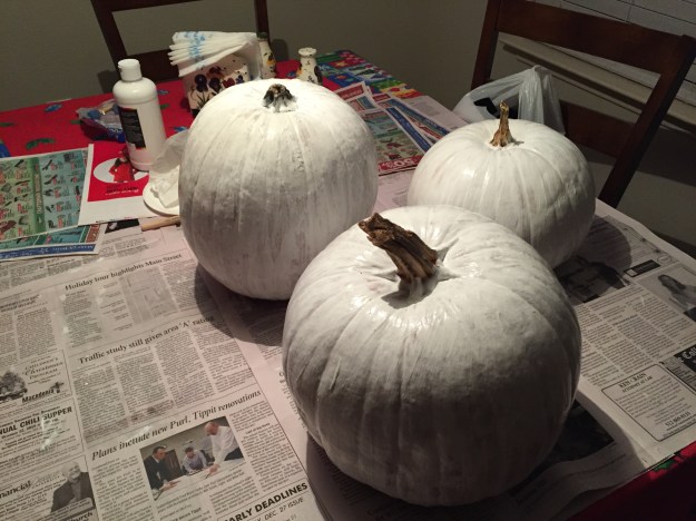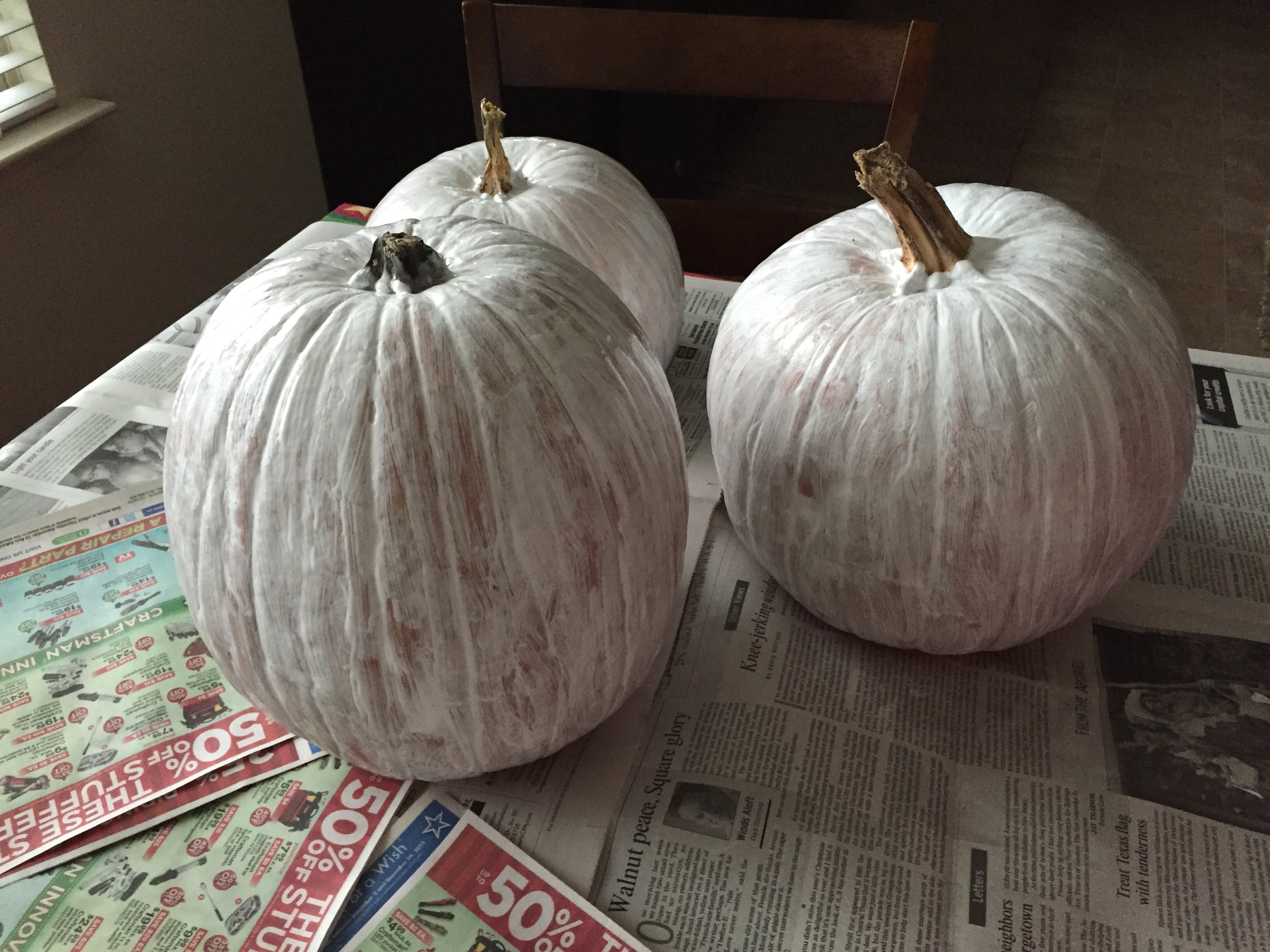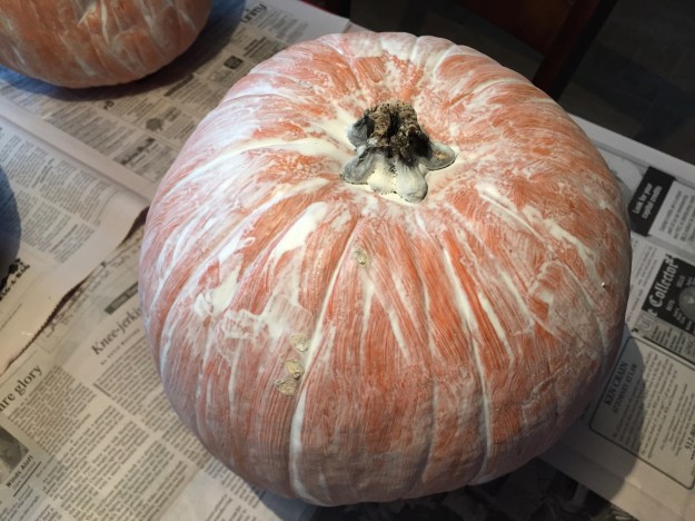 After three coats (pumpkins on left in above photo), I definitely could tell the pumpkins were getting whiter, but I still could see the orange.After four coats, the pumpkins don’t look too bad! In fact, they’re pretty darn white, doncha think? I’ll have to see how they look after they dry all the way, to see if I need to add yet a fifth coat.