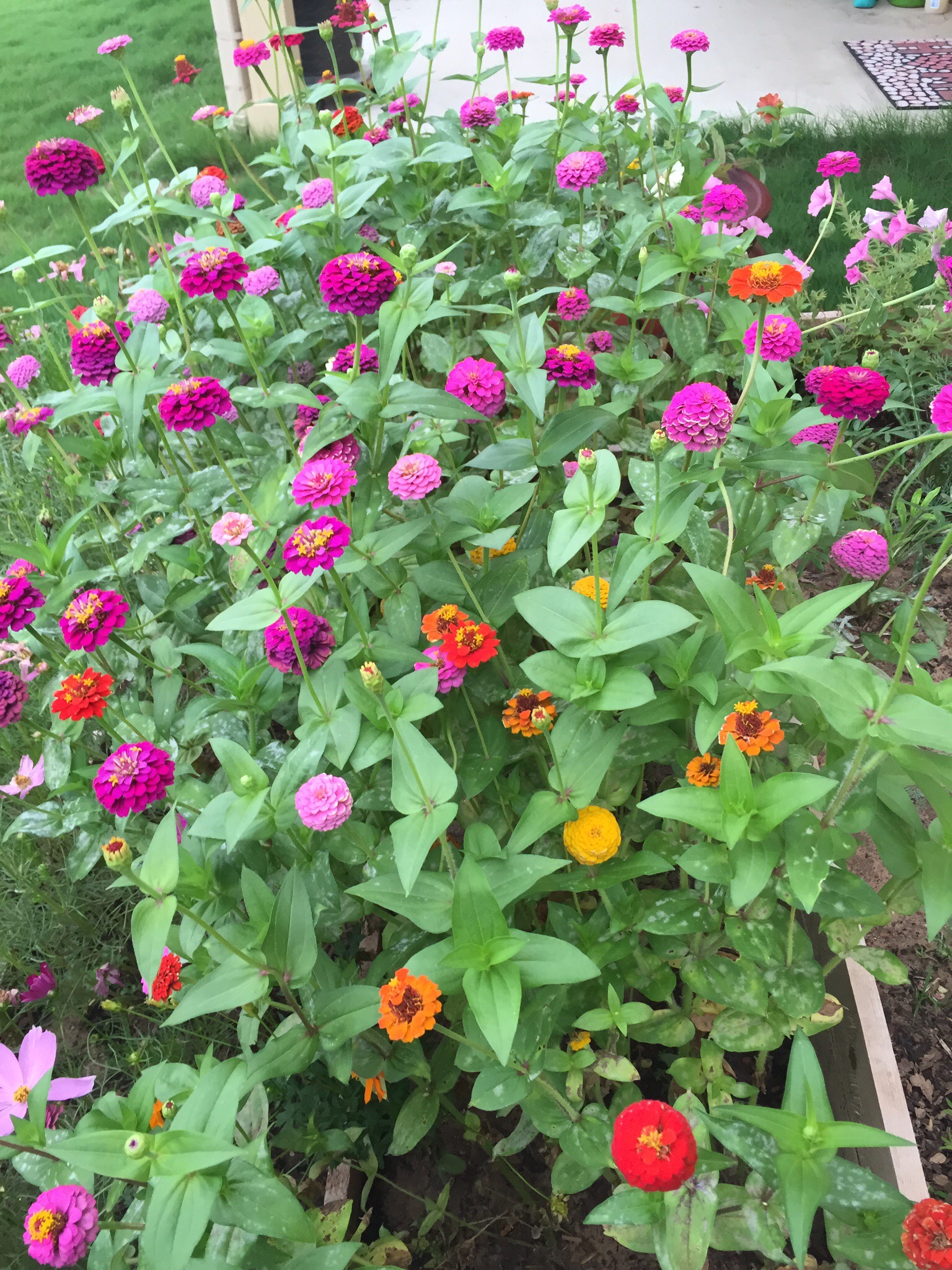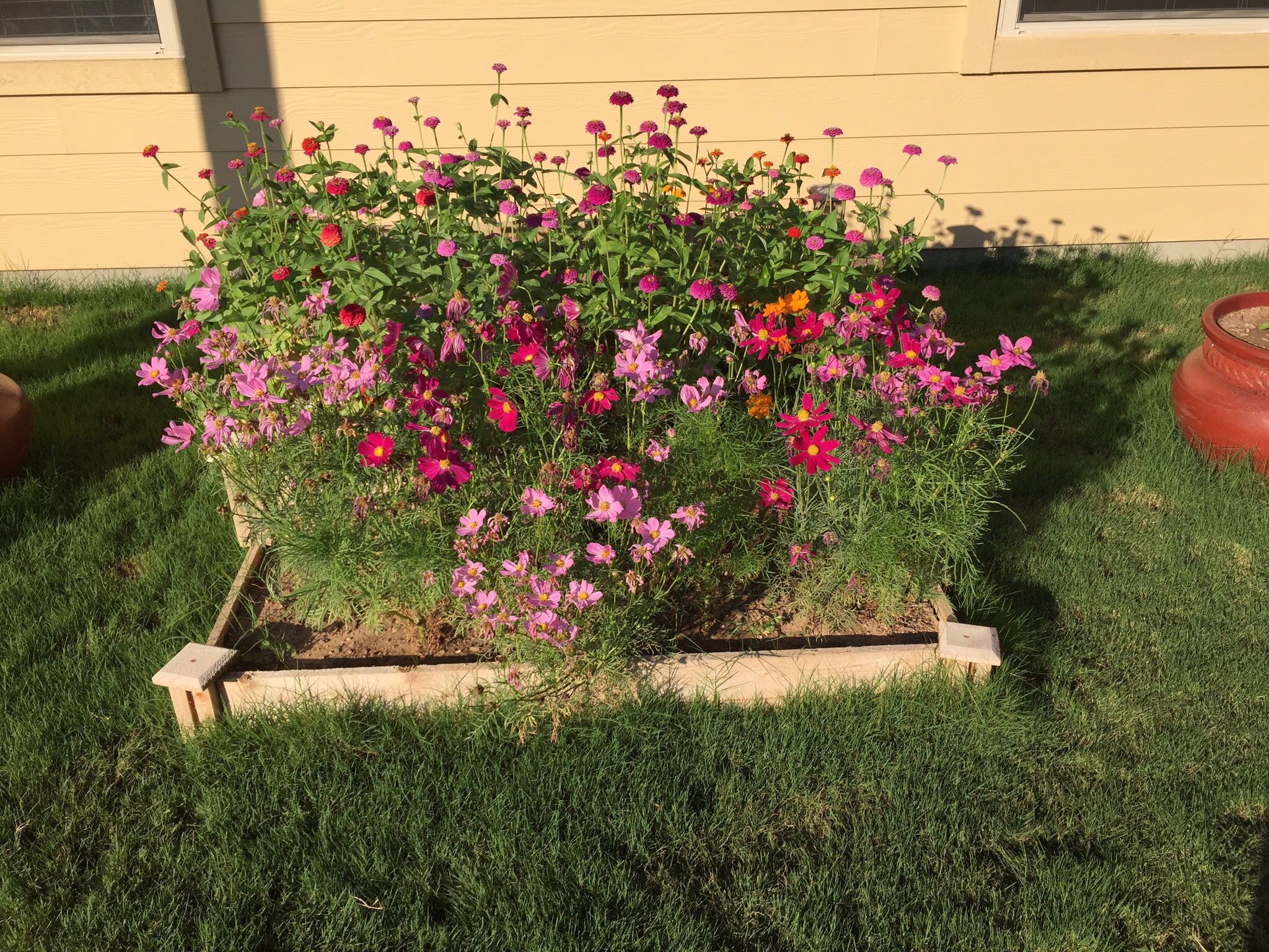 I’m thrilled with the flowers that have survived since March. Yes, March! Coming from Wisconsin’s much shorter growing season, I love the extra time I get to enjoy my zinnias, marigolds, poppies and gazanias. Mind you, it’s just one of the three beds that have kept blooming, but it’s the bed that was shielded much of April through July by the flowers in the lower tiers.