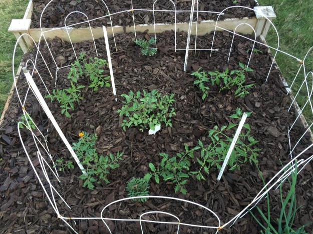 But what’s a girl to do? Three of the four beds I devote to veggies have tomatoes in them. I suppose when the peas and lettuce in the fourth bed are done, I could always transplant tomatoes to that bed, too.
