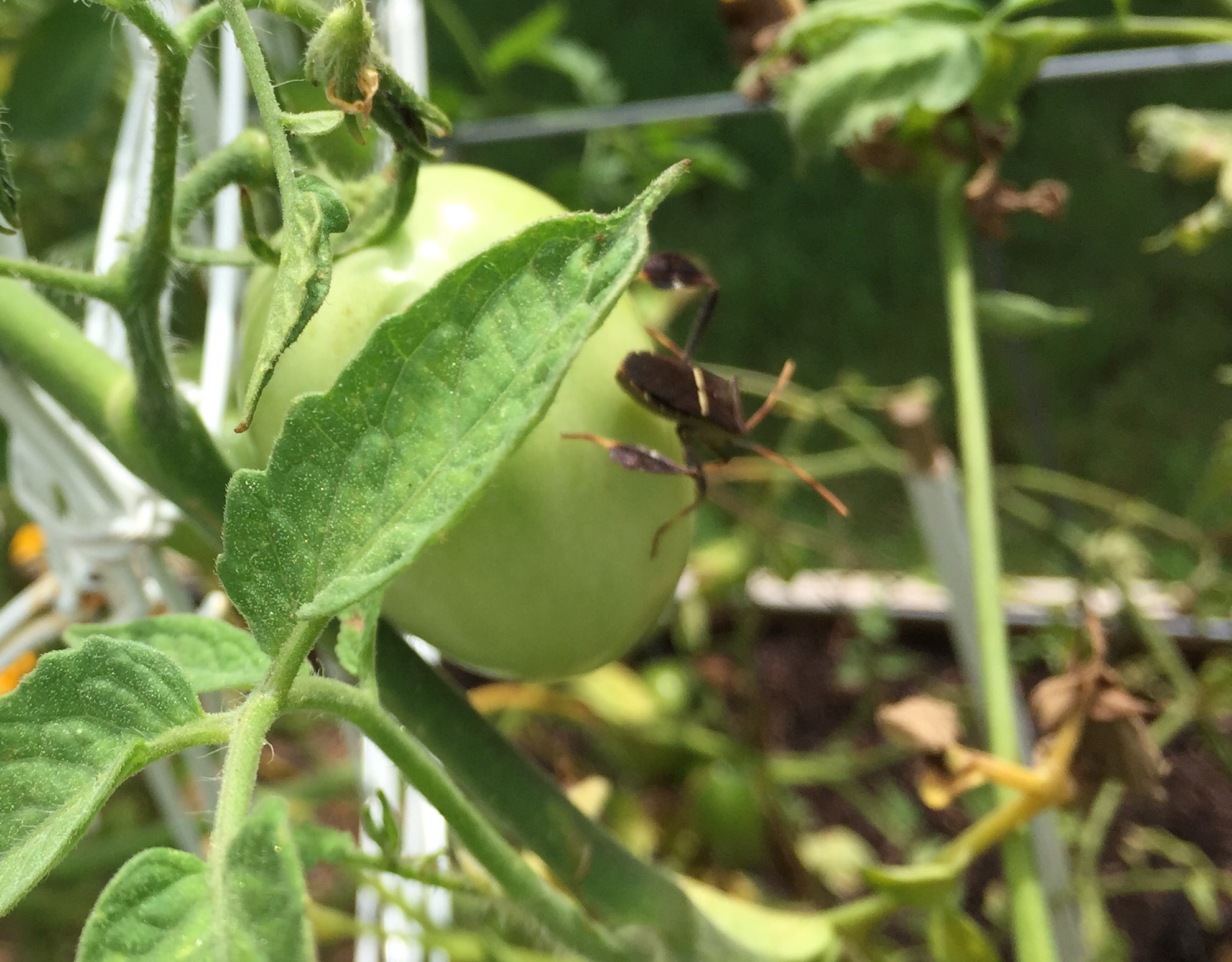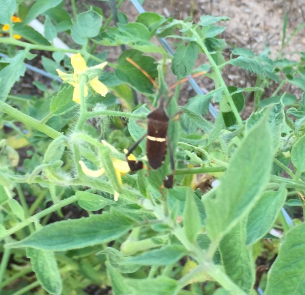 A little time on the internet tells me it’s the leaf-footed bug, which I don’t recall seeing in Wisconsin. I’m not sure if it’s totally responsible for the pocked tomatoes, but it’s getting the blame right now. I’ll have to keep a close eye on the ‘maters and dispose quickly of the bugs I find.